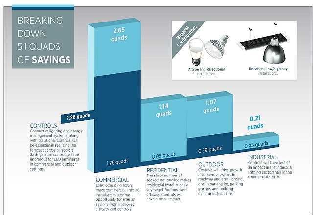 The granularity of the new data model has allowed the DOE to pinpoint the applications and usage scenarios where LED lighting will make the biggest impact. Commercial applications will represent 2.65 quads and residential 1.14 quads. Across different applications the use of autonomous and programmatic controls will account for 2.28 quads in savings.